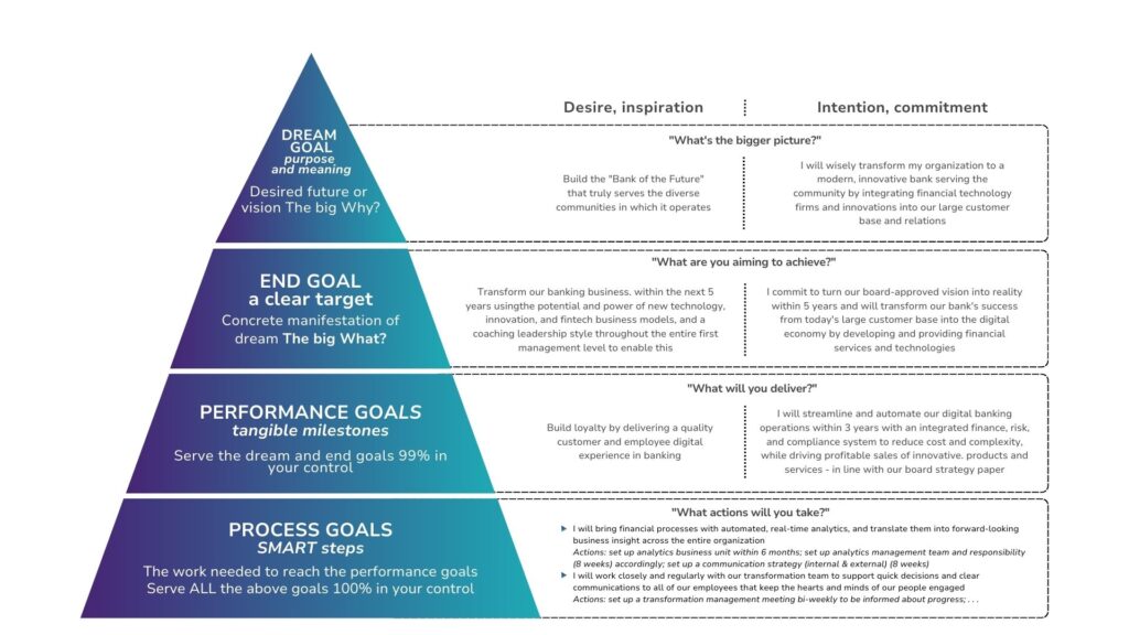 The diagram shows goal setting as a journey, moving from a broad vision to practical action.